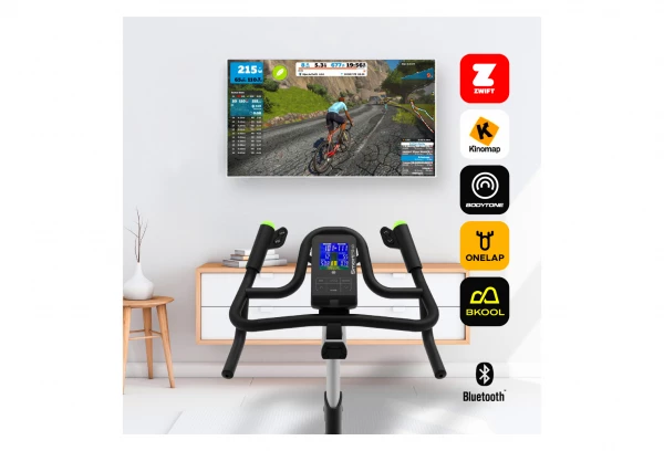 -Conectividad: La consola incorporada en esta bicicleta implementa la tecnología bluetooth 4.0 que permite conectarse con dispositivos android e IOS y enviar los datos de la sesión de ejercicio en tiempo real a aplicaciones como Zwift, Bkool, Mybodytone, Kinomap, Onelap entre otras. También permite enlazar pulsómetros bluetooth de la marca Polar y compatibles con bluetooth 4.0. La bicicleta conectada a apps simuladores de ciclismo como Zwift, Bkool, Mybodytone, Kinomap, Onelap y puede ajustar automáticamente la resistencia en función de la ruta seleccionada, también puede modificar la resistencia de forma manual y tener un control total del ejercicio.
