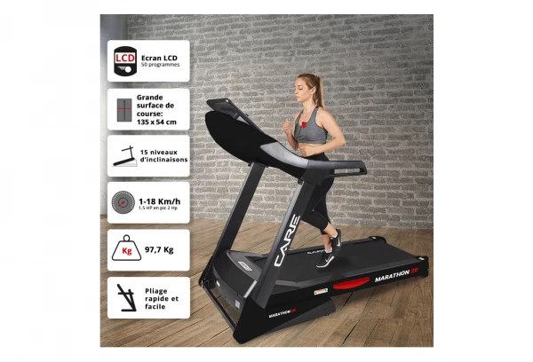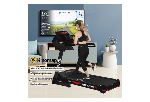Le tapis de course Marathon20 possède un moteur 2.5 CV en continu, 5 CVP en vitesse maximale qui permet un confort de course et rend votre séance plus efficace.