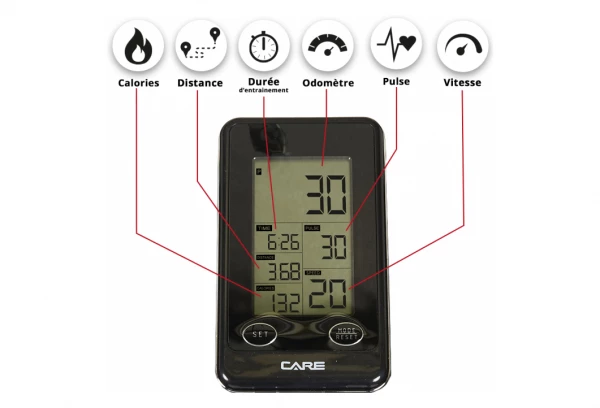 Le vélo de biking Racer XPR est équipé d’un compteur qui intègre les fonctions essentielles pour le suivi de votre progression.