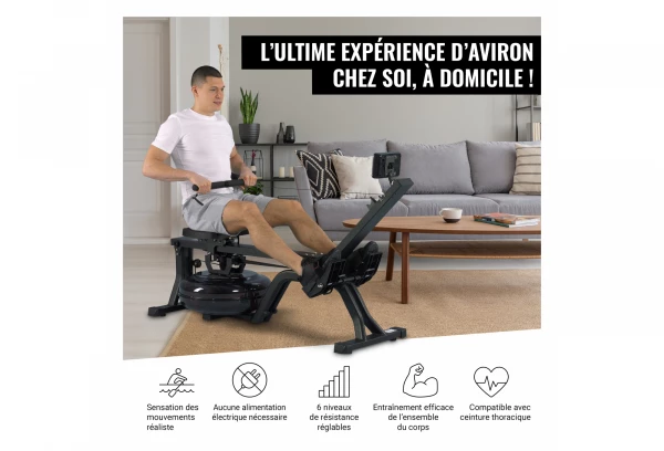 Ce rameur convient aux débutants comme aux sportifs les plus aguérris. Il dispose d’ un système qui mime la rame en canoé grâce à une résistance à eau. Cette configuration apporte une meilleure fluidité de mouvement.