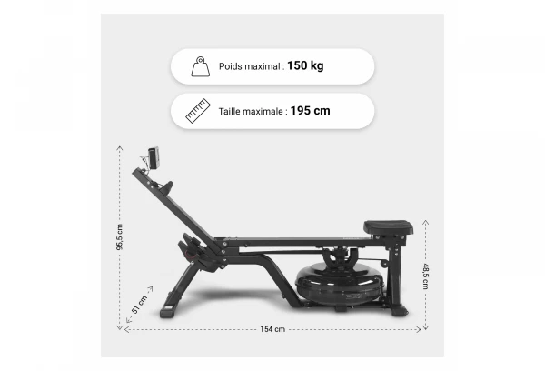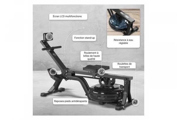 - Inclus à la livraison : rameur, pompe pour remplir et vider l’ eau, tablette de purification de l’ eau