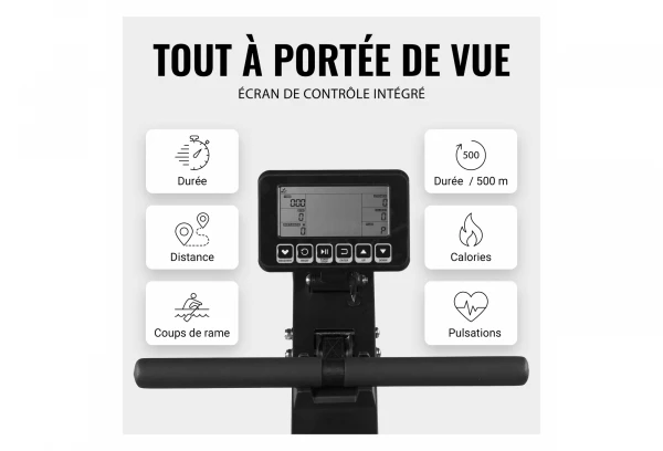 - Moniteur de suivi intégré avec plusieurs modes d’ affichage : heure, date, température, durée, distance parcourue, calories consommées, pulsations cardiaques, nombre de coups de rame et nombre de coups de rame par minute