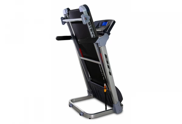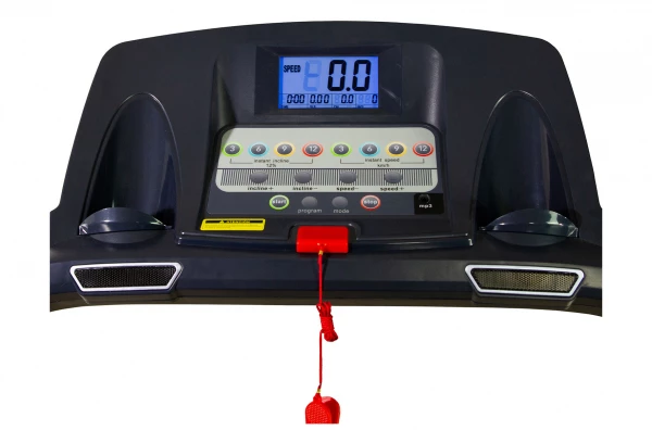 Le tapis de course T100 est doté d’un moniteur LCD rétroéclairé avec 6 programmes d’entraînement prédéfinis (Prg) et 1 test de graisse corporelle (BF)