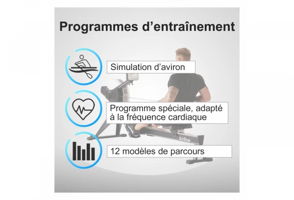 L’ AirRow convient à tous les âges et aussi bien aux personnes débutantes qu’ aux professionels de l’ aviron. Nous recommandons cependant aux personnes non entraînées de commencer par des séances d’ entraînement plutôt courtes (environ 10 minutes) et d’ augmenter progressivement la durée.