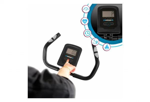 Le CYCLO intègre des capteurs de pouls tactiles sur le guidon pour un meilleur suivi de vos séances avec 4 fonctions principales s’affichant sur l’écran LCD (fonctionne avec des piles AAA non fournies) : le temps écoulé, la vitesse, la distance parcourue et le nombre de calories dépensées.