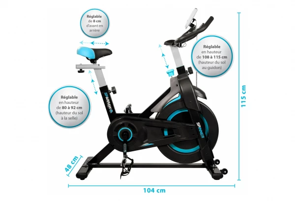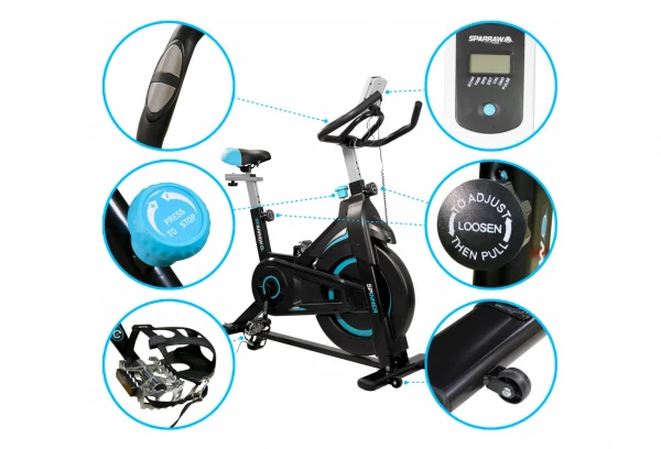 Le SPINNER de la marque SPARRAW est un vélo de spinning doté d’un système de résistance manuelle magnétique progressif et d’une roue d’inertie de 6 kg pour un pédalage doux, fluide et efficace.