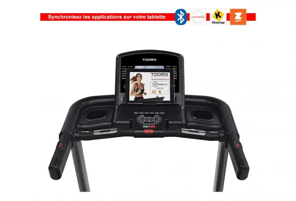 Le tapis de course TOORX VOYAGER est doté d’un équipement multimédia avancé, APP READY 3.0, qui garantit, avec la clé TRX APP GATE 3.0 en option, une pleine compatibilité et interactivité avec les applications les plus motivantes du moment: Kinomap, iConsole+ et Zwift.